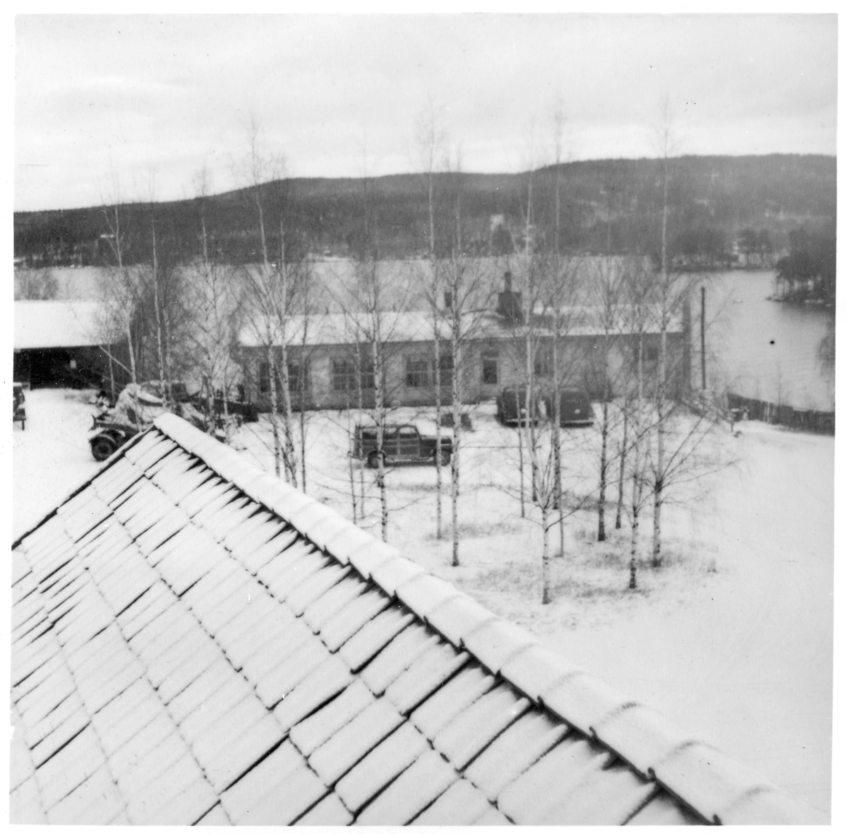 VFW, Depåförråd (Vmo W6). Vy över garageplan mot vägstationens verkstads- och garagebyggnad. Personbilar framför byggnaden.
