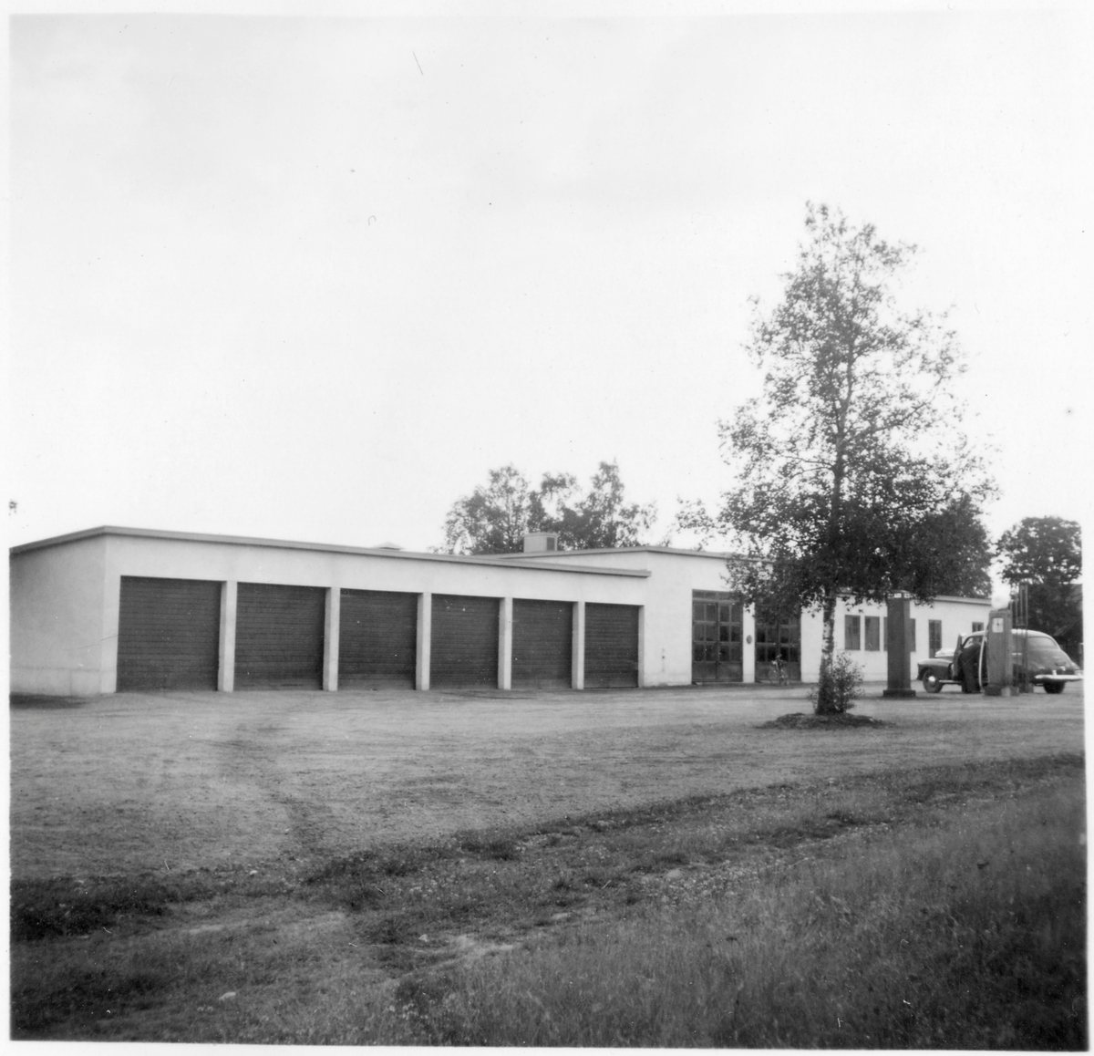 Vägstation G3, Vislanda. Byggnad innehållande garageanläggning, verkstadsdel, kontorsdel. Bensinpumpar (drivmedelspumpar), personbil med mansperson.