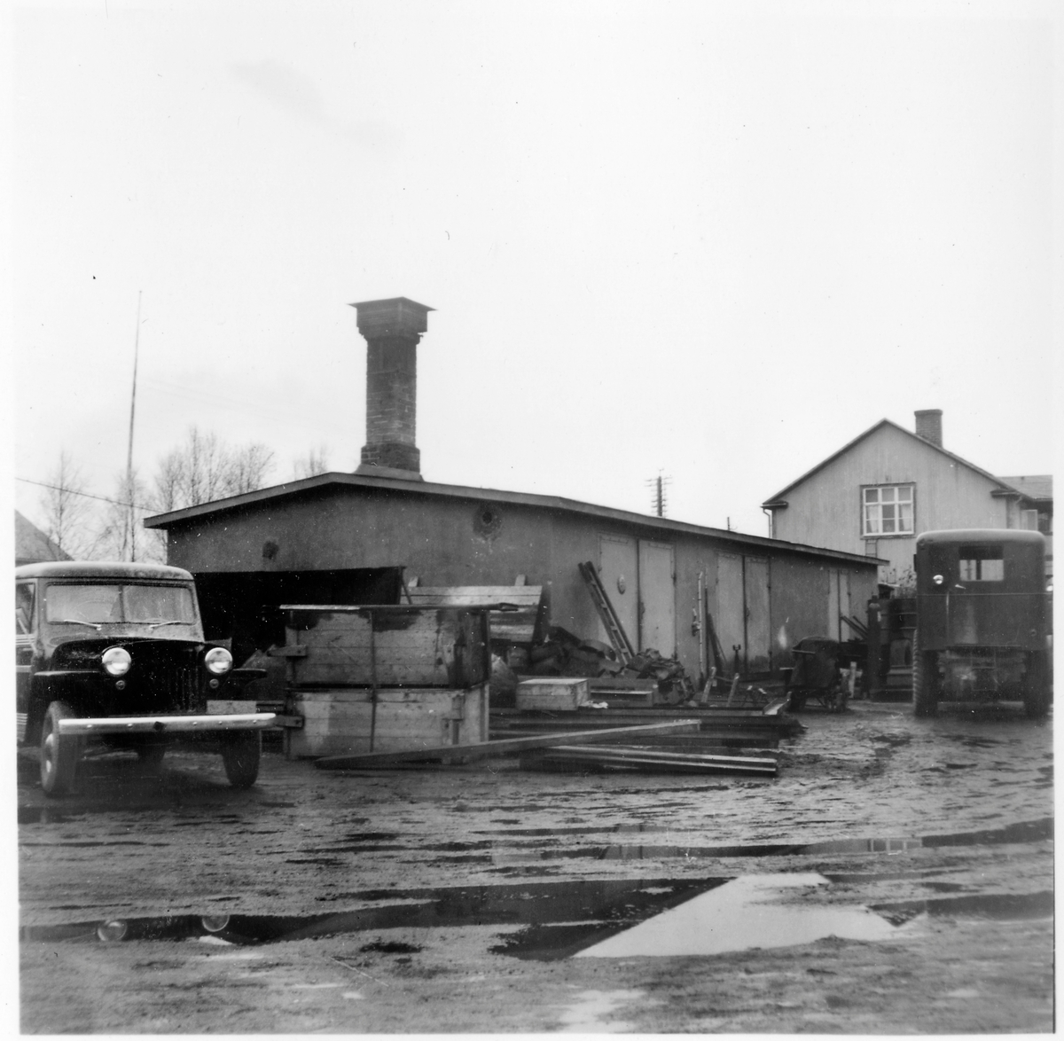 Vägstation BD4 Boden, Svartbjörnsbyn. Förrådsbyggnad. Verkstad (smedja) i byggnadens främre del. Bostadshus i bakgrunden. Väghyvel, personbil. Upplag av diverse materiel, "skrot". Redskapslådor.