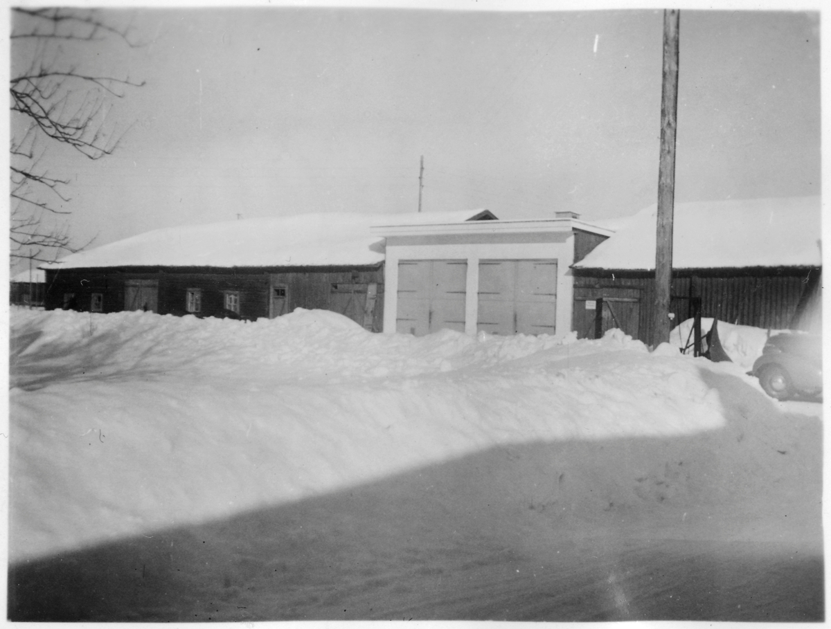 Vägstation Y15, Junsele. Garage- och förrådsbyggnad, inrymt i ladugårdsbyggnad. Sidoplog till höger (vinterbild).