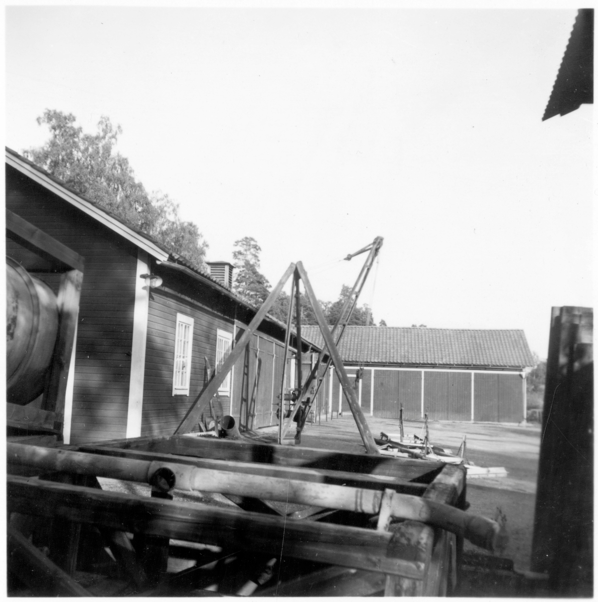 Vägstation E13, Stjärnvik. Garagelänga och förrådsbyggnad byggd i vinkel. Sten- och stubbrytare. Vägsladdar.