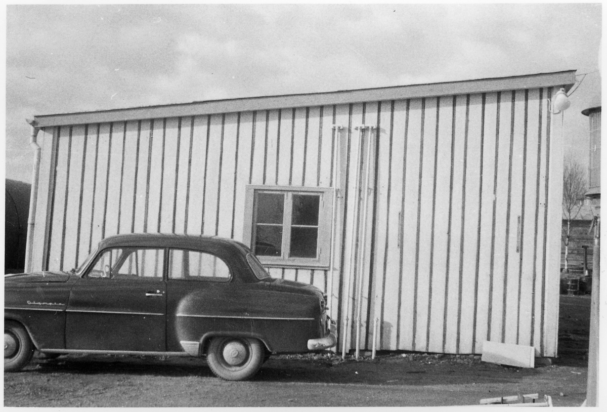 Vägstation B5 Rimbo. Rimbogården. Utbildningslokaler för Kungl. Väg- och vattenbyggnadsstyrelsen (Vägverket). Förrådsbyggnad. Opel Olympia Rekord vid gaveln.