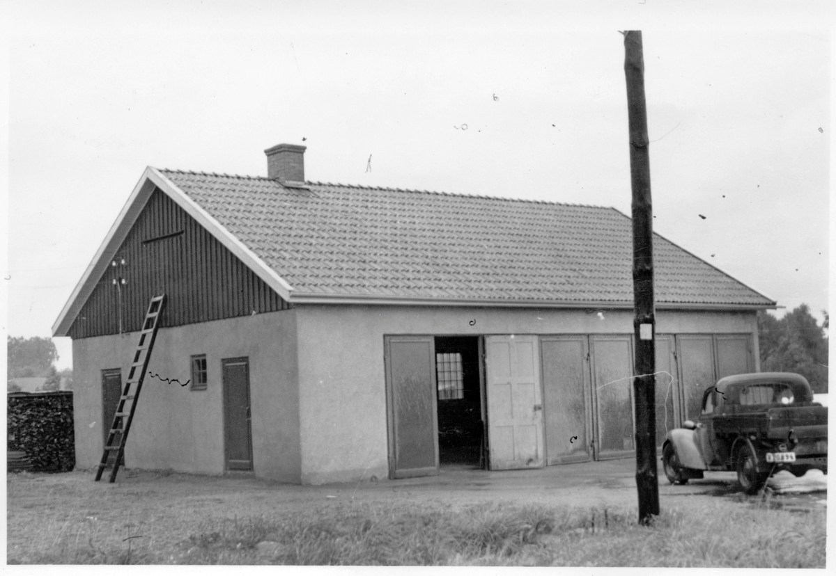 Vägstation R8, Falköping, filial Floby. Förråds- och garagebyggnad. Liten lastbil (paketbil) framför garageporten.