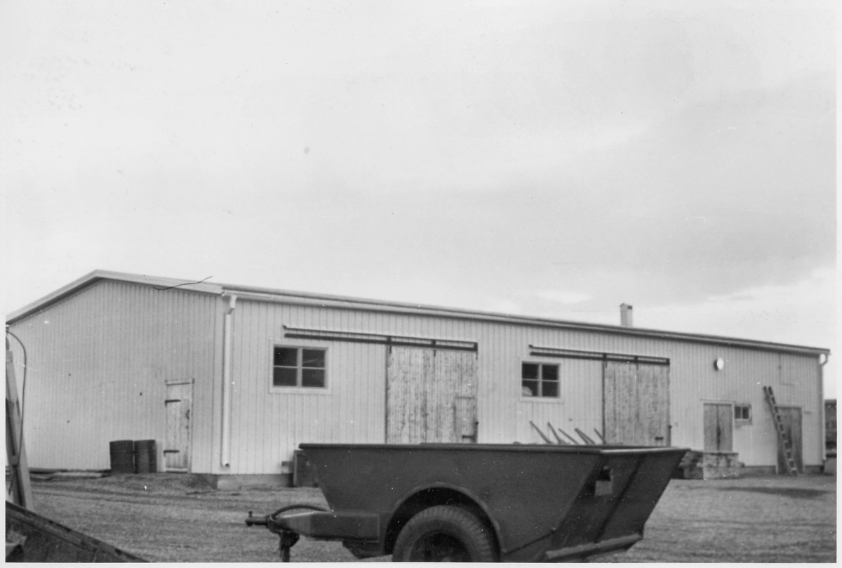Vägstation Z11, Hammerdal. Förrådsbyggnad. I förgrunden grus- och sandkärra.