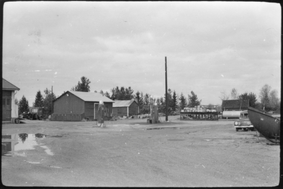 Vägstation AC3, Umeå. Vy över garageplan med olika förrådsbyggnader. Spetsplog, bensinpumpar (drivmedelspumpar), väghyvel, drivmedelstank ("farmartank") och personbil.
