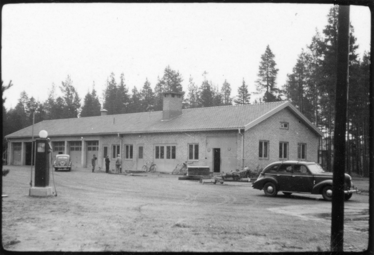 Vägstation AC4, Vännäs. Vägstationens huvudbyggnad, med från vänster garage, kontor, förråd och verkstad. På garageplan två personbilar, bensinpump (drivmedelspump), cyklar mot väggen, tre manspersoner.