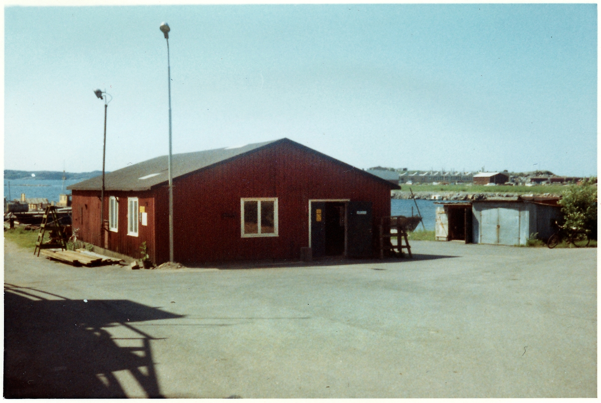 VFO, Färjevarvet, Fridhem. Förrådsbyggnad. Färja i vattnet framför byggnaden. Bostadshus i bakgrunden.