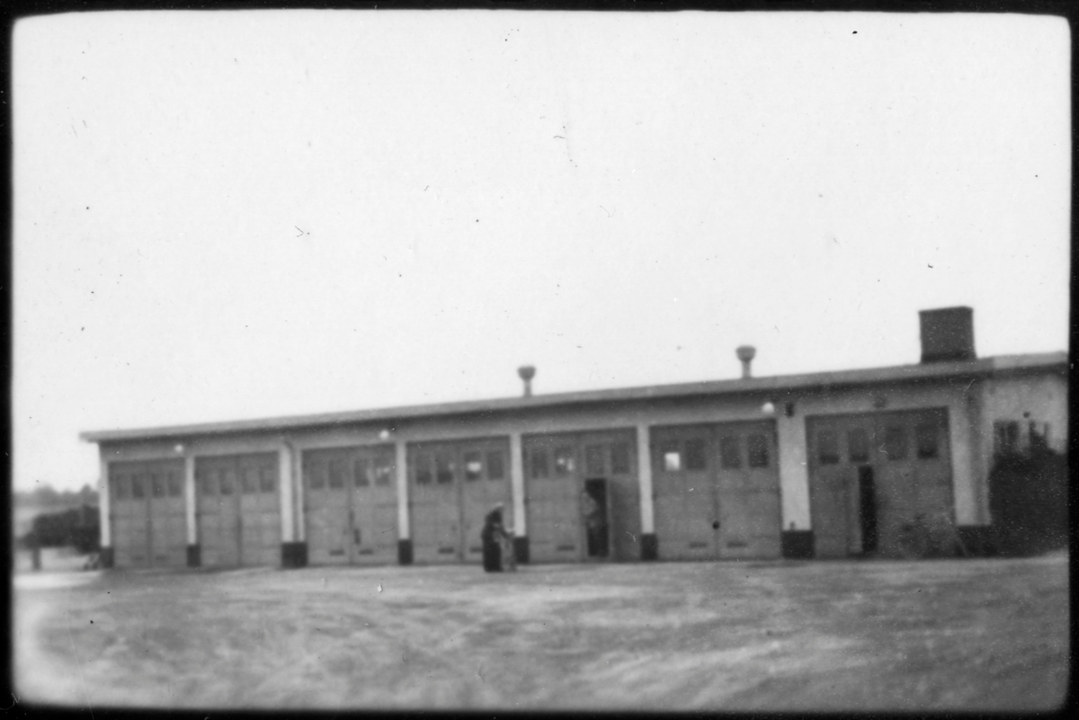 Vägstation Vmo E3, Boxholm, filial Ödeshög. Garagebyggnad. Mansperson på garageplan.