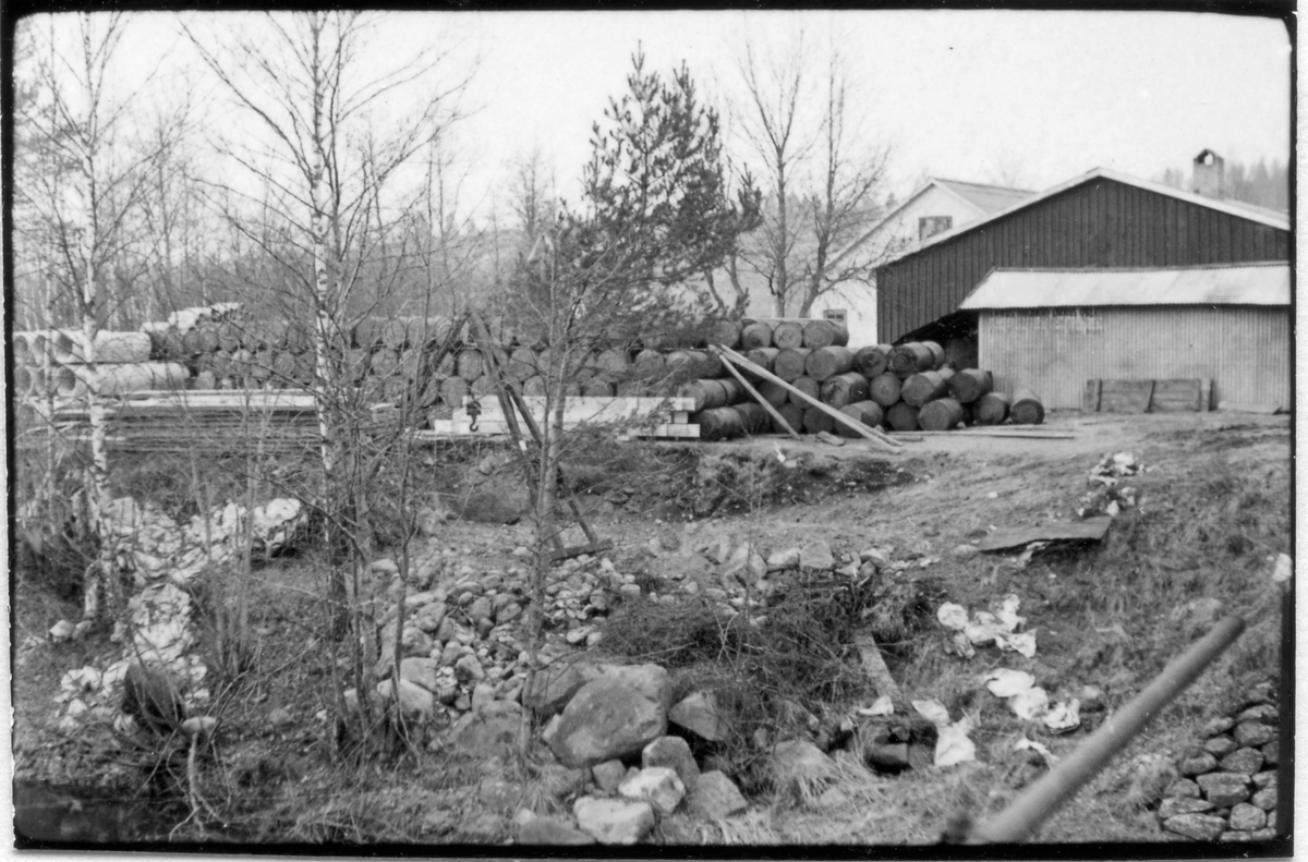 Vägstation F10, Tranås. Förrådsbyggnad. Vid gaveln en mindre förrådsbyggnad av korrugerad plåt. Upplag av bränslefat och cementrör, sten- och stubbrytare.