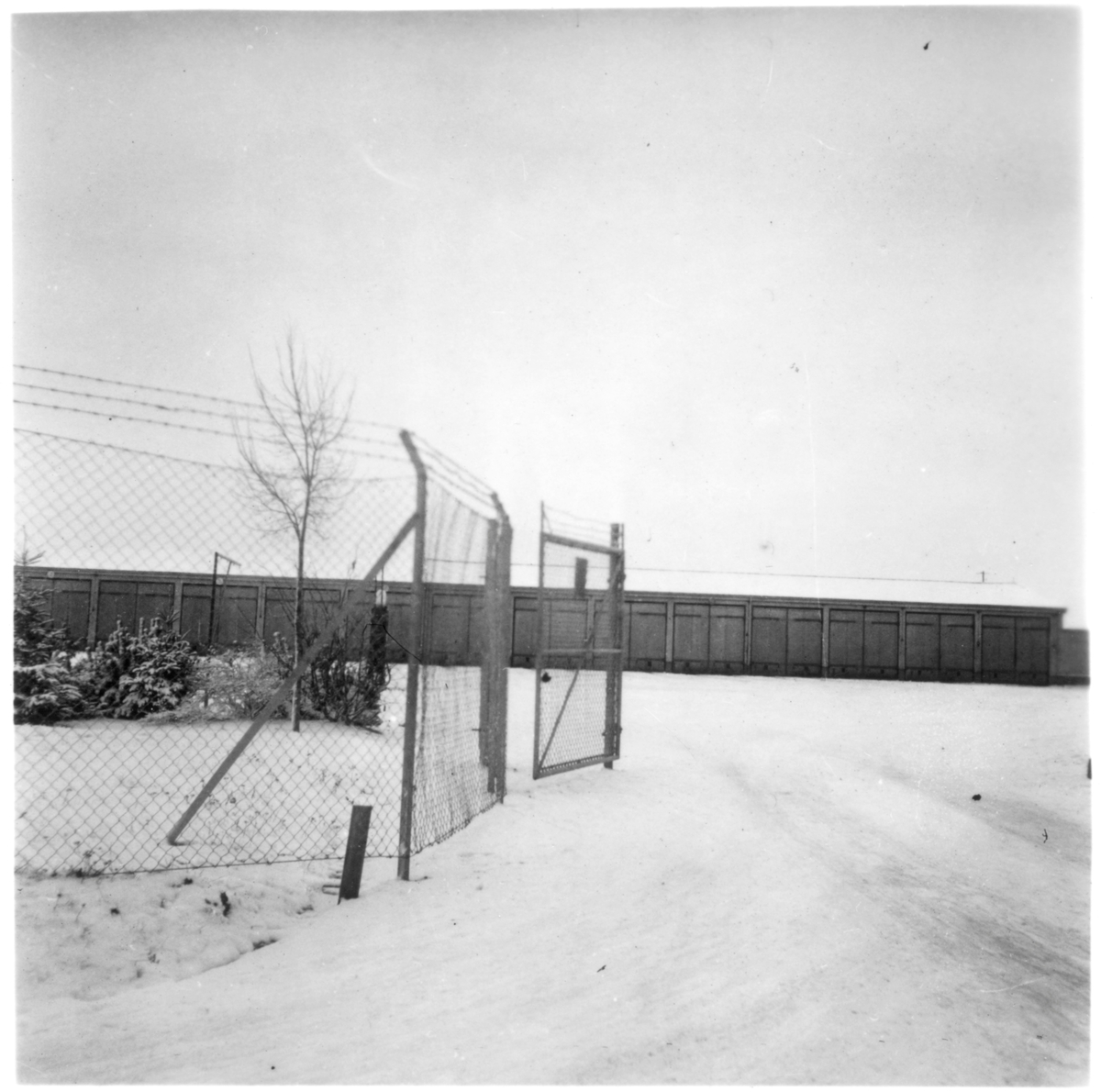 Vägstation M7, Dalby. Vy över garageplan med garagebyggnaden i bakgrunden. Nätstängsel och grind.
