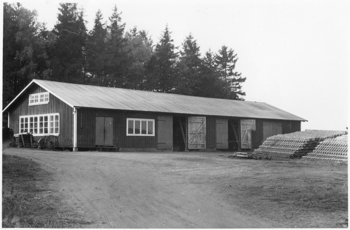 Vägstation N3, Kvibille. Förrådsbyggnad. Upplag av snöskärmar. Vägsladd framför snöskärmarna. Vid gavel slipstensbock med slipsten.