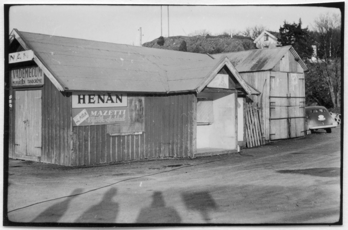 Vägstation O4, Henån. Garagebyggnad i korrugerad plåt, portar på gaveln. Bredvid byggnad av typen "kiosk" med olika reklamskyltar och skylt "Henån" på gaveln. Invid väg.