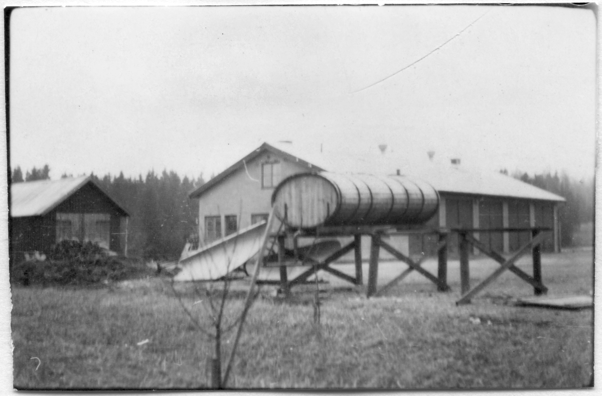 Vägstation O6, Hedekas. Garagebyggnad. Vid gaveln vitmålad spetsplog, sidoplog. Luttunna på ställning. Till vänster förrådsbyggnad.
