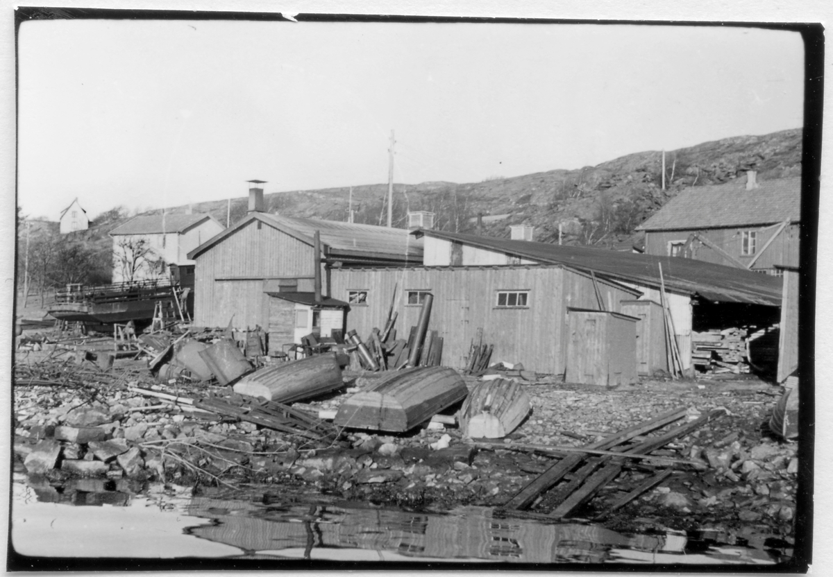 VFO, Färjevarvet, Fridhem. Varvets huvudbyggnad med kontor och förråd, i bakgrunden, samt olika förrådsbyggnader. Diverse upplag av olika material. Färja uppdragen på land på slipers. Mindre roddbåtar upplagda på stranden. Diverse material, "skrot" runt byggnaderna. Bostadshus i bakgrunden.