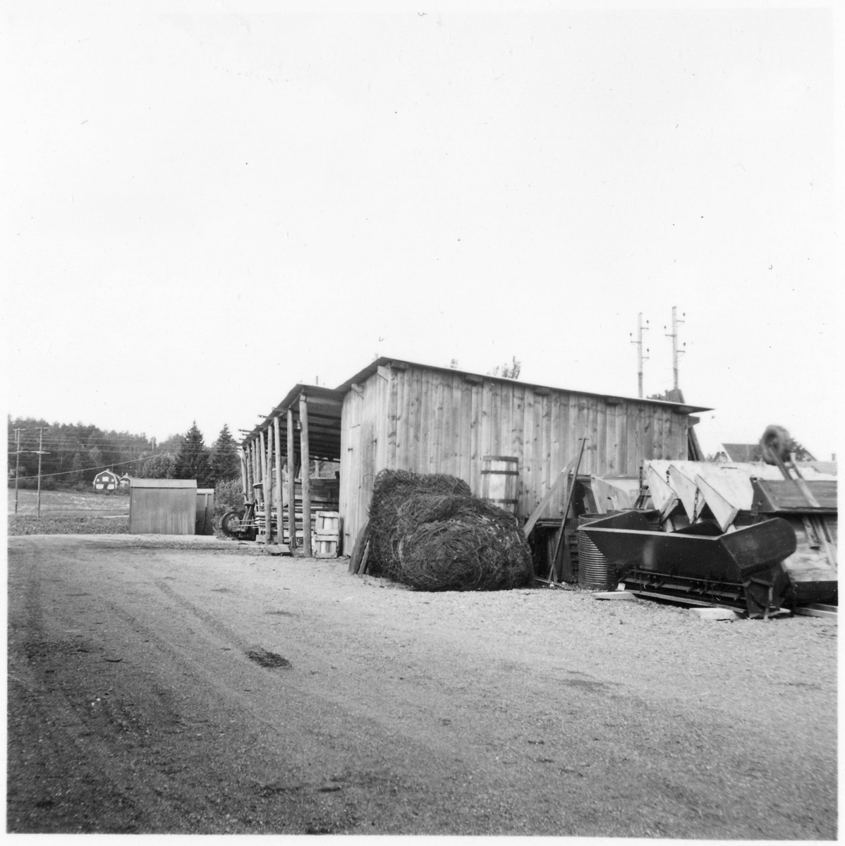 Vägstation E4, Rimforsa. Öppen förrådsbyggnad. Uppställda sandspridare.