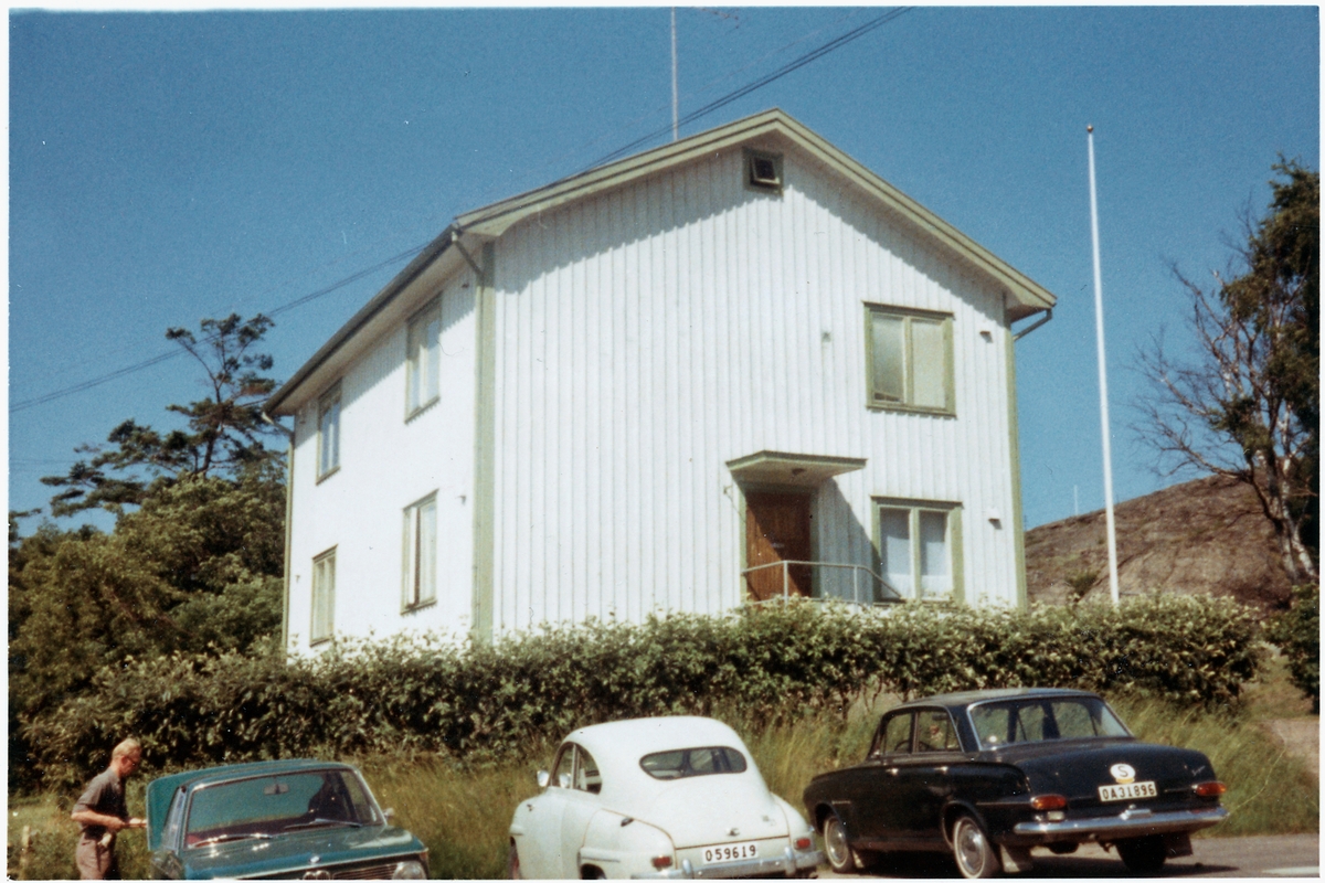 VFO, Färjevarvet, Fridhem. Bostadshus. Personbil Saab O59619 och personbil OA21896, parkerade framför byggnaden.