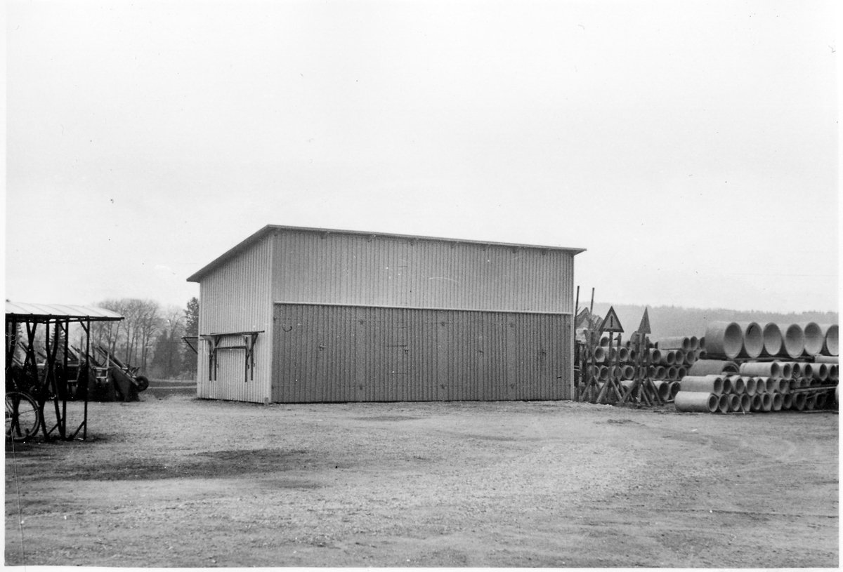 Vägstation P1, Hid. Förrådsbyggnad. Till vänster cykelställ med cyklar, skottkärror. Till höger om byggnaden upplag av cementrör, uppställda vägmärken "Annan fara".