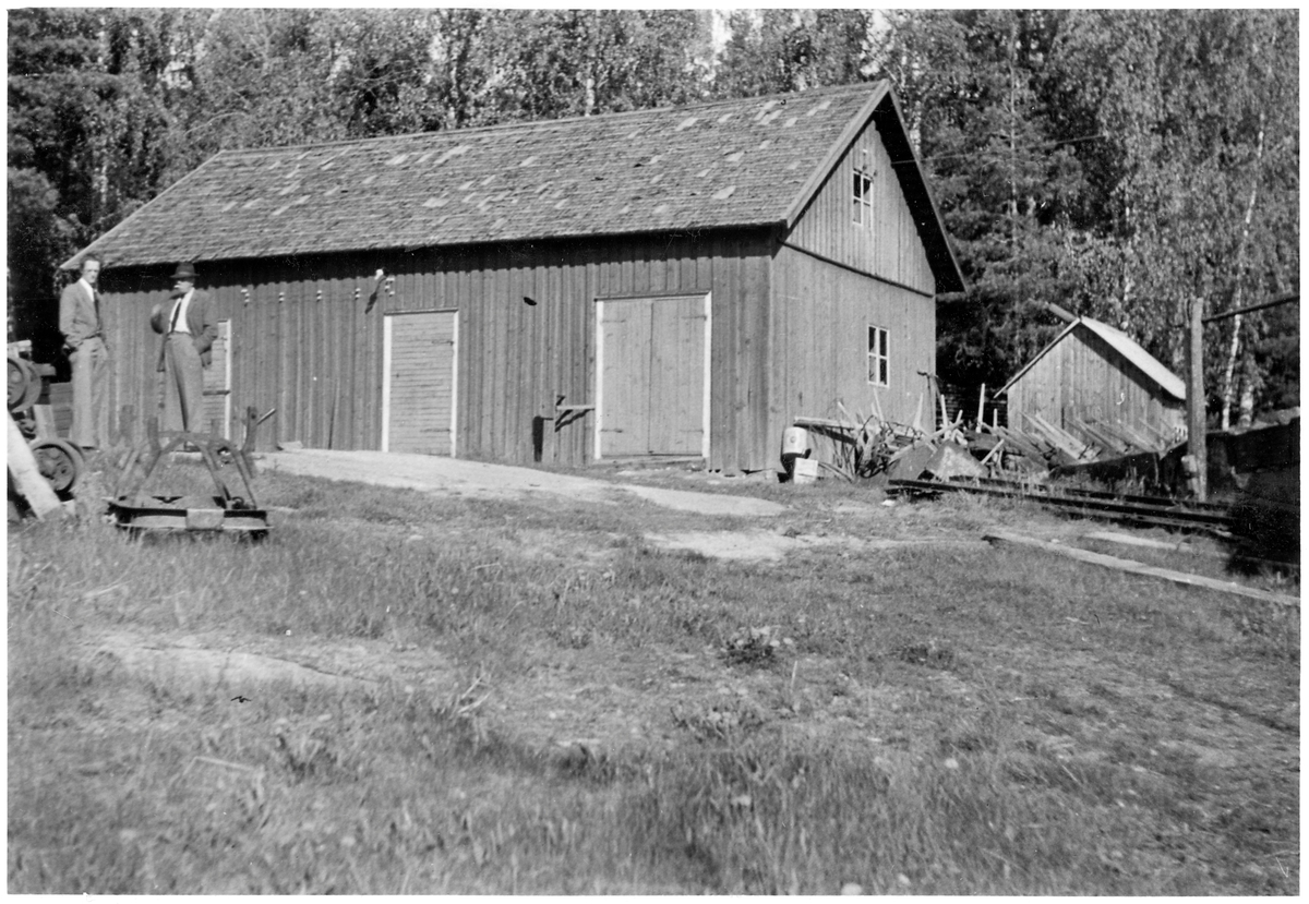 Förrådsbyggnader. Vid gaveln upplag av skottkärror, underredet till decauvillevagn. Två manspersoner framför byggnaden.