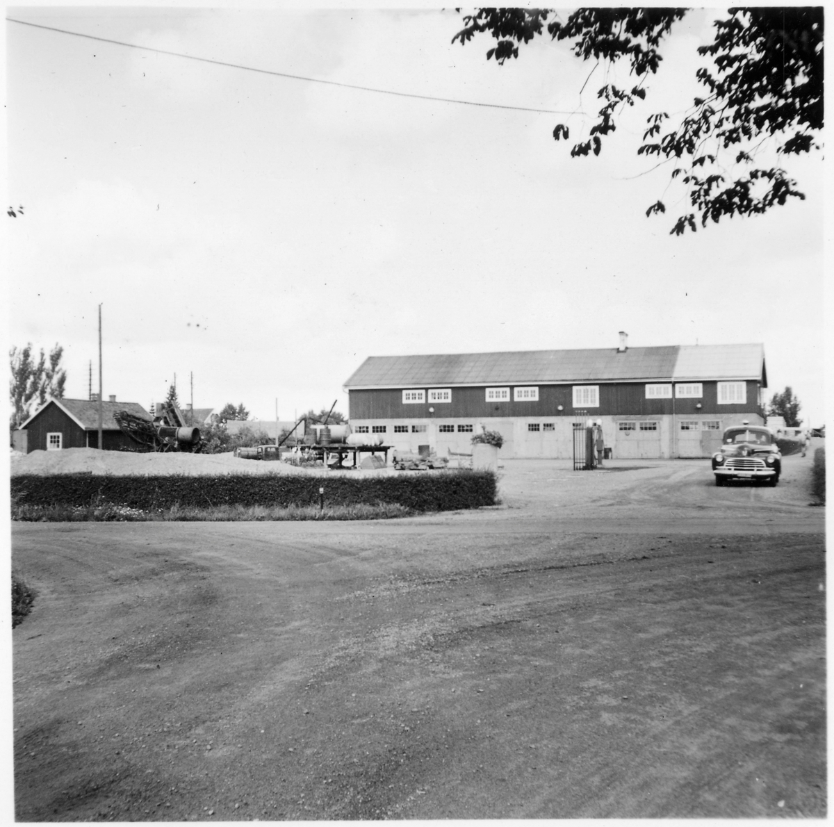 Vägstation E4, Rimforsa. Garagebyggnad med förråd på övervåning. Personbil. Bensinpumpar (drivmedelspumpar). Grussorteringsverk till vänster.