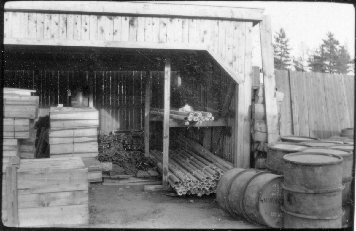 Depåförråd VFAC (Vmo AC5, Vindeln). Förrådsbyggnad, öppet skjul, med diverse materiel, bland annat järnrör, skopor till lastningselevator, bränslefat.