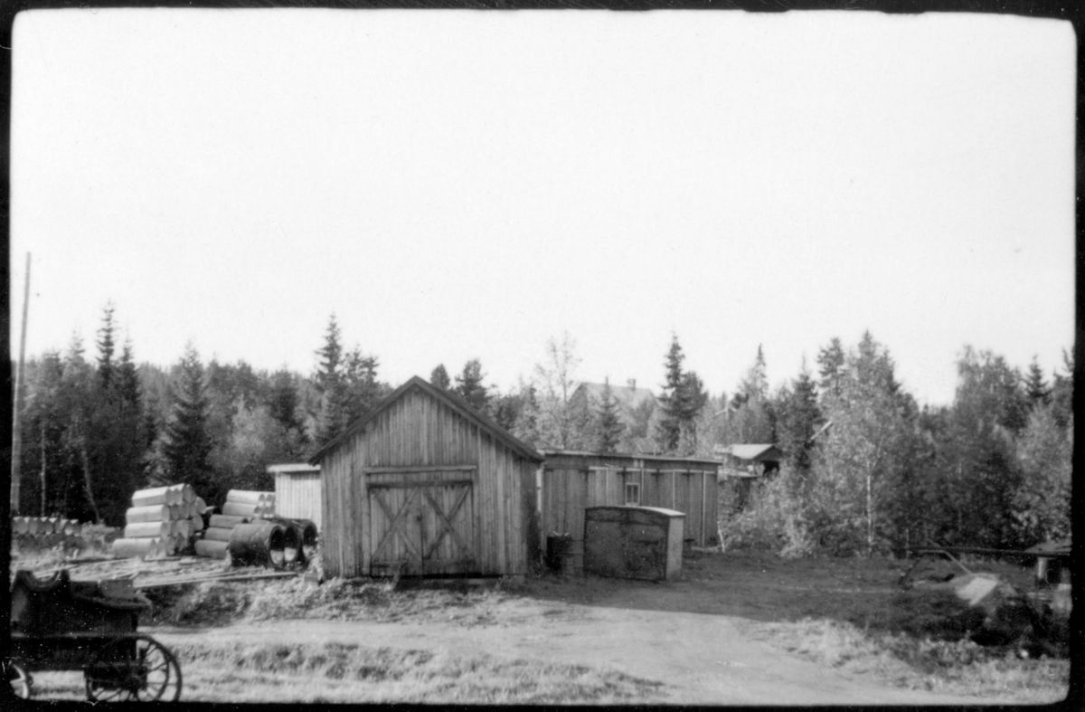 Vägstation AC19, Storuman. Förrådsbyggnader. Stenkross i förgrunden. Upplag av cementrör.