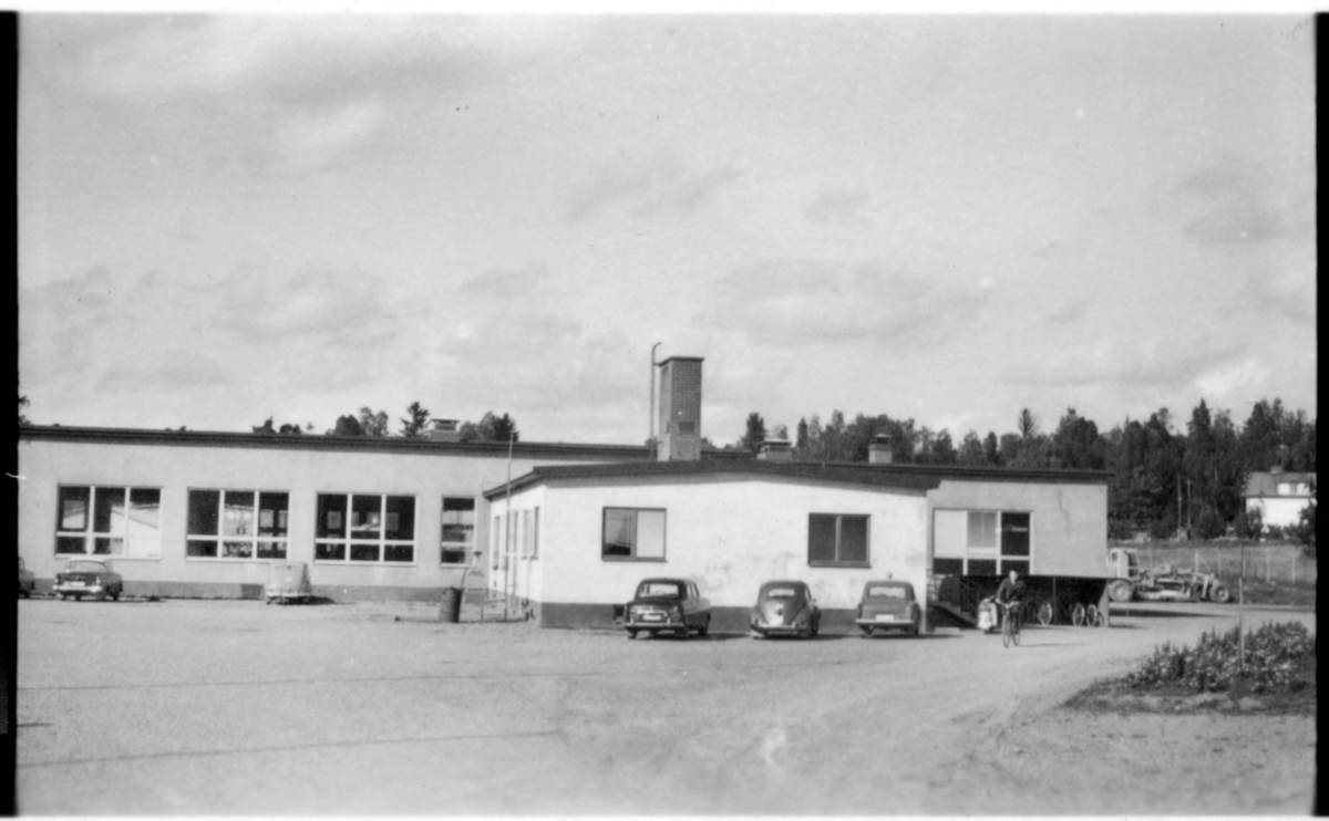 Vägstation D5, Flen. Verkstadsbyggnad och kontorsbyggnad. Personbilar parkerade framför kontorsbyggnaden. Person som cyklar. Väghyvel i bakgrunden.
