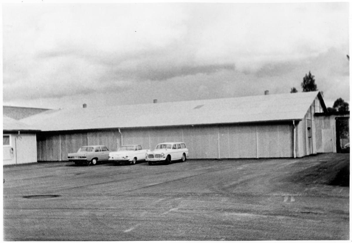 Vägstation G. Okänd plats. Förrådsbyggnad. Personbilar, bland annat Volvo 145.