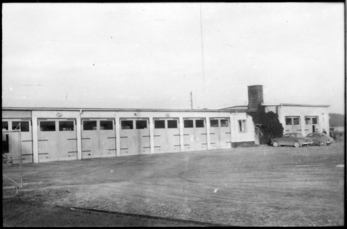 Titel: Vägstation P1, Hid. Vägstationens huvudbyggnad med garage, kontor och verkstad. Framför byggnaden personbil Volvo Amazon och Saab.