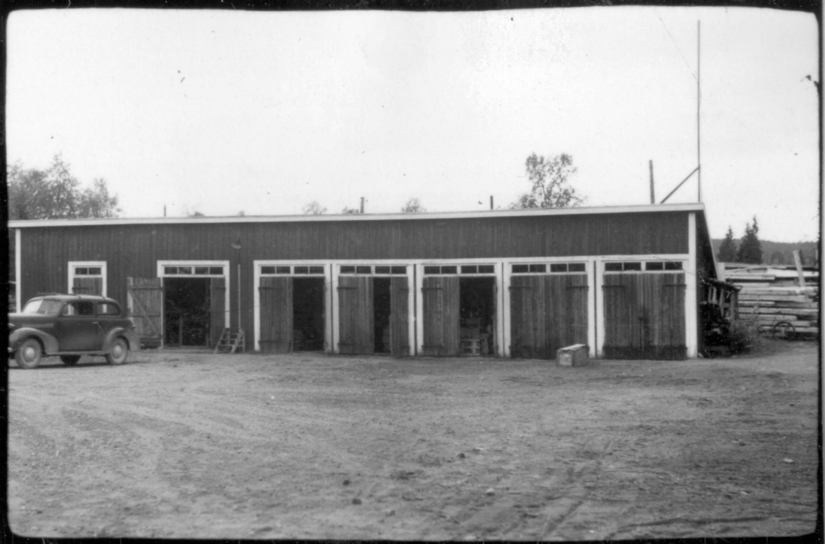 Vägstation AC20, Sorsele. Förrådsbyggnad. Personbil parkerad framför byggnaden.