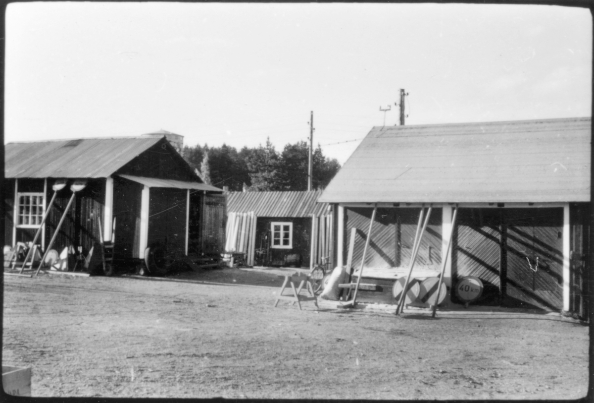 Vägstation AC14, Lycksele. Förrådsbyggnad till vänster, garagebyggnad till höger. Vägmärken uppställda mot väggen, bland annat "Hastighetsbegränsning upphör", hastighetbegränsningsmärke "40".