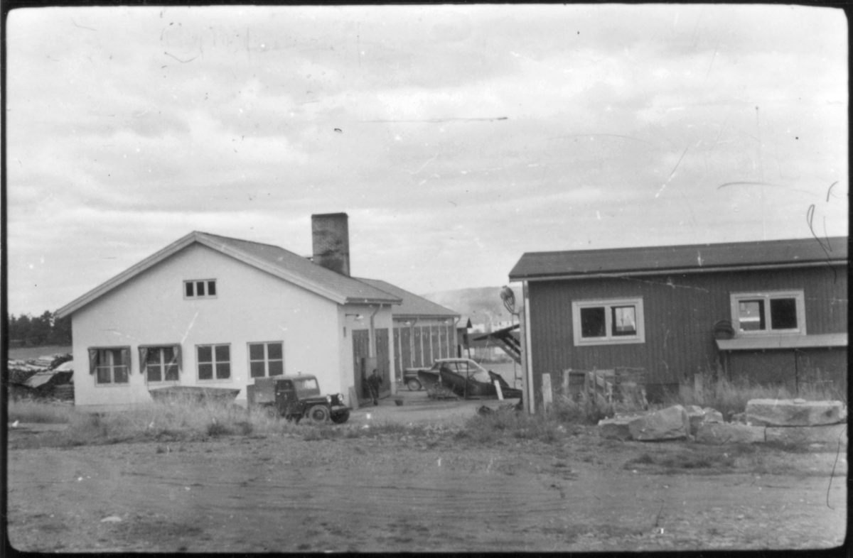 Vägstation AC9, Skellefteå. Vägstationens huvudbyggnad med verkstad och garage, till vänster. Förrådsbyggnad till höger. Fordon, typ Jeep, med släpkärra, sidoplog och spetsplog, personbil framför garagebyggnaden.