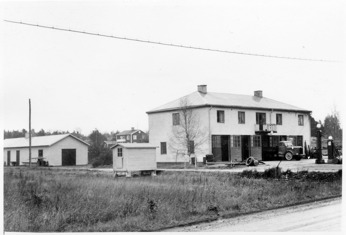 Vägstation Vmo B2, Knutby. Vägstationens huvudbyggnad med garage i undervåningen. Kontor/bostad i övervåningen. Lastbil inbackad i en garageport. Bensinpumpar (drivmedelspumpar). Invid väg.
