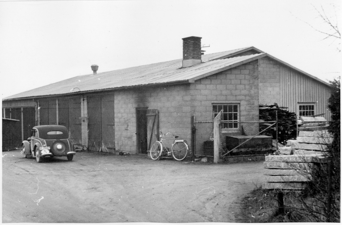 Vägstation P2, Kinna. Garagebyggnad med smedja i hitre delen. Framför byggnaden personbil, cykel lutad mot väggen. Upplag av kantsten.