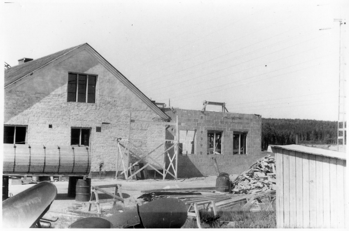 Vägstation S3, Filipstad. Garagebyggnad (gaveln). Arbete med tillbyggnad (i cementblock) pågår. Luttunna, uppallad på bränslefat, spetsplog framför byggnaden.