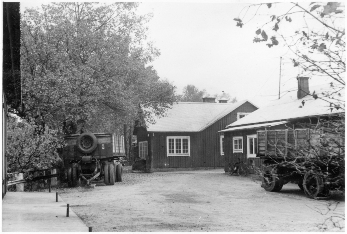 Vägstation N2, Skedala. Förrådsbyggnader. Två stycken tvåaxlade släpvagnar till lastbil. Moped lutad mot förrådsbyggnaden.