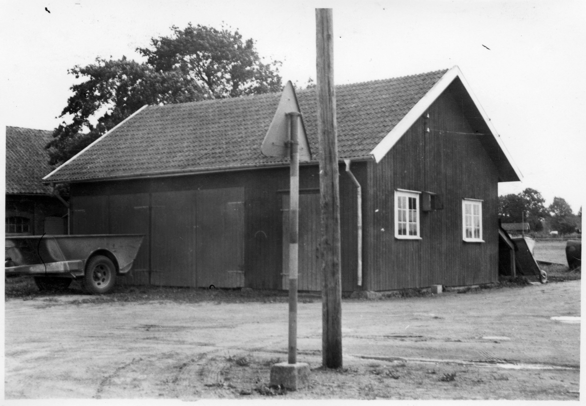 Vägstation R9, Lidköping, filial Vinninga. Garagebyggnad. Framför byggnaden grusspridare, vägmärke (baksidan).