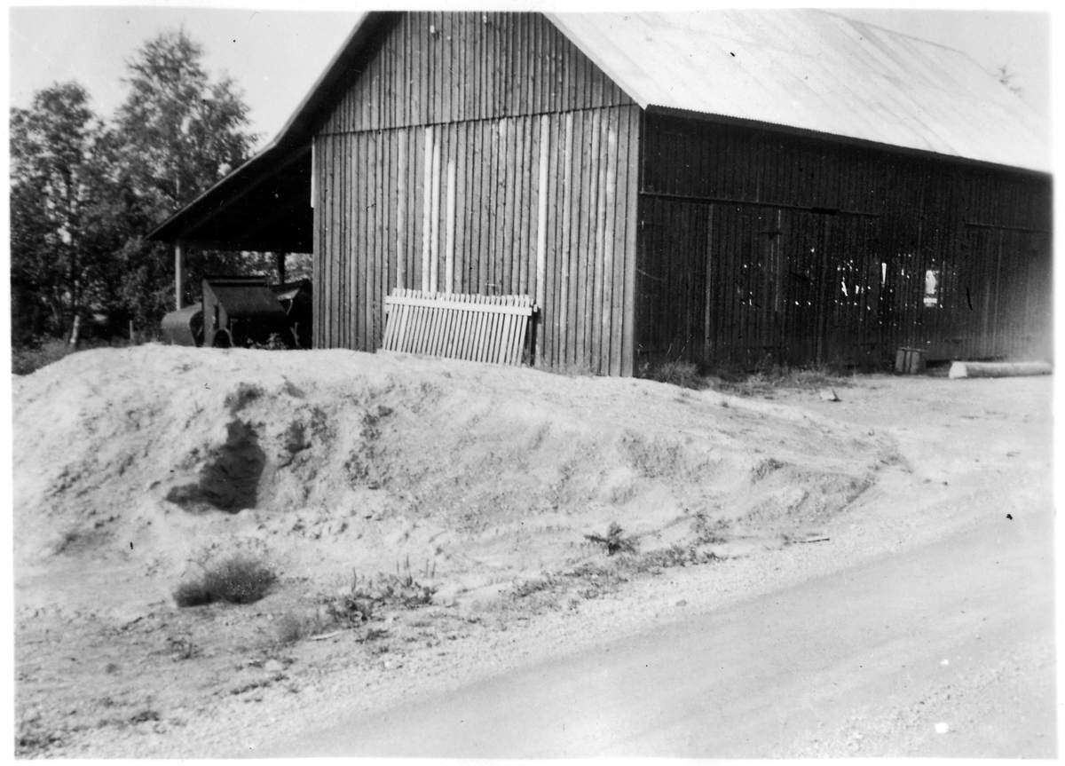 Vägstation P16, Bengtsfors, filial Brohögen. Garage- och förrådsbyggnad. Utskjutande tak på baksidan, därunder decauvillevagnar.