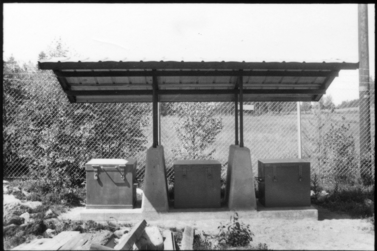 Vägstation Vmo X11, Delsbo. Tre sprängkistor för förvaring av dynamit, under öppet tak
