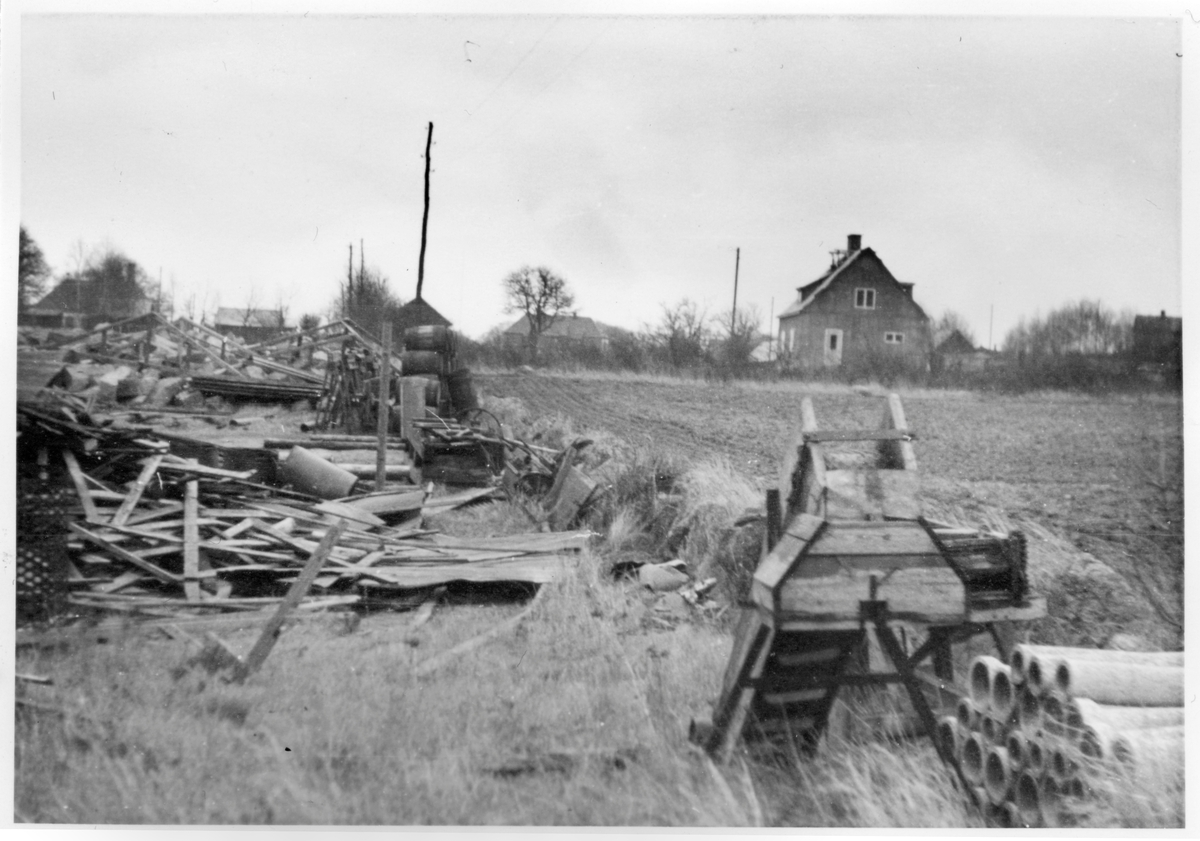 Vägstation L8, Vitaby, filial Brösarp. Vägstationens område, med diverse material, "skrot". I bakgrunden bostadshus.