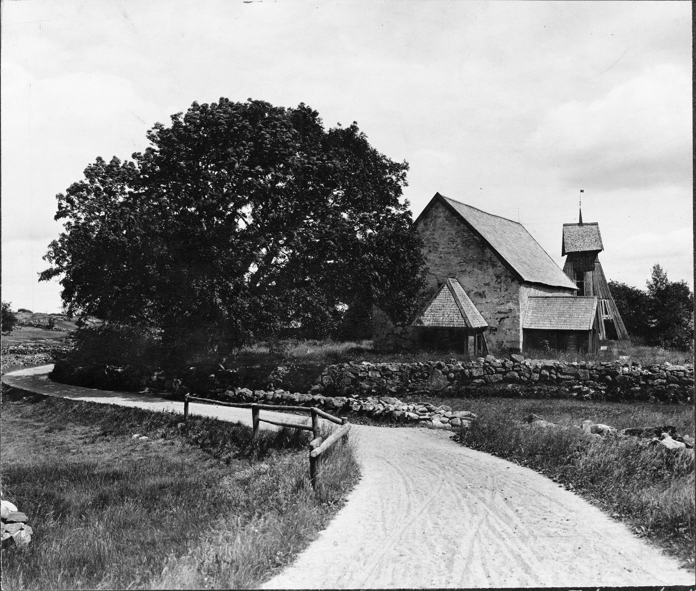 Kyrkan och klockstapeln från sydväst.