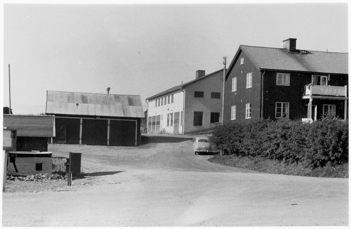 Vägstation Z3, Brunflo, filial Valla. Vägstationens byggnader med från vänster garagebyggnad, vägstationens huvudbyggnad med garage, verkstad och förråd. Till höger bostadshus. Personbil framför bostadshuset. Invid väg.