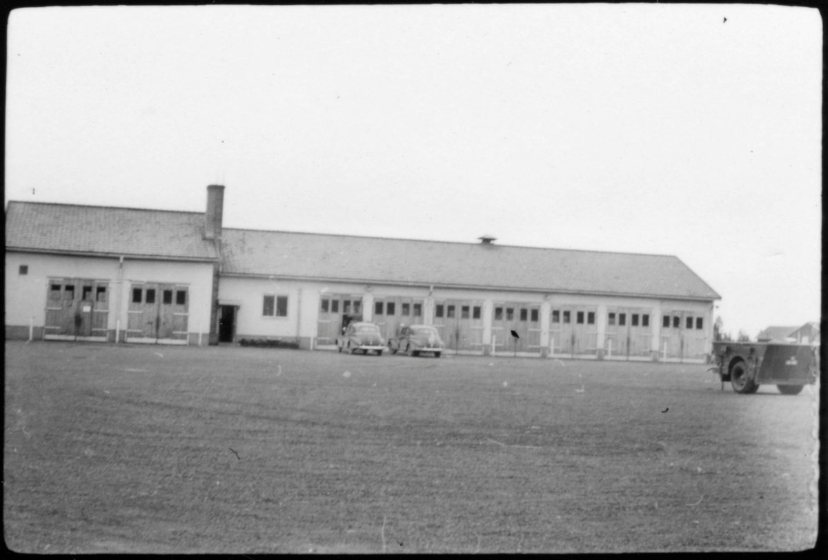 Vägstation AC13, Malåträsk. Vägstationens huvudbyggnad. Från vänster verkstad, kontor, garage. Sand- och gruskärra, två personbilar på garageplan.