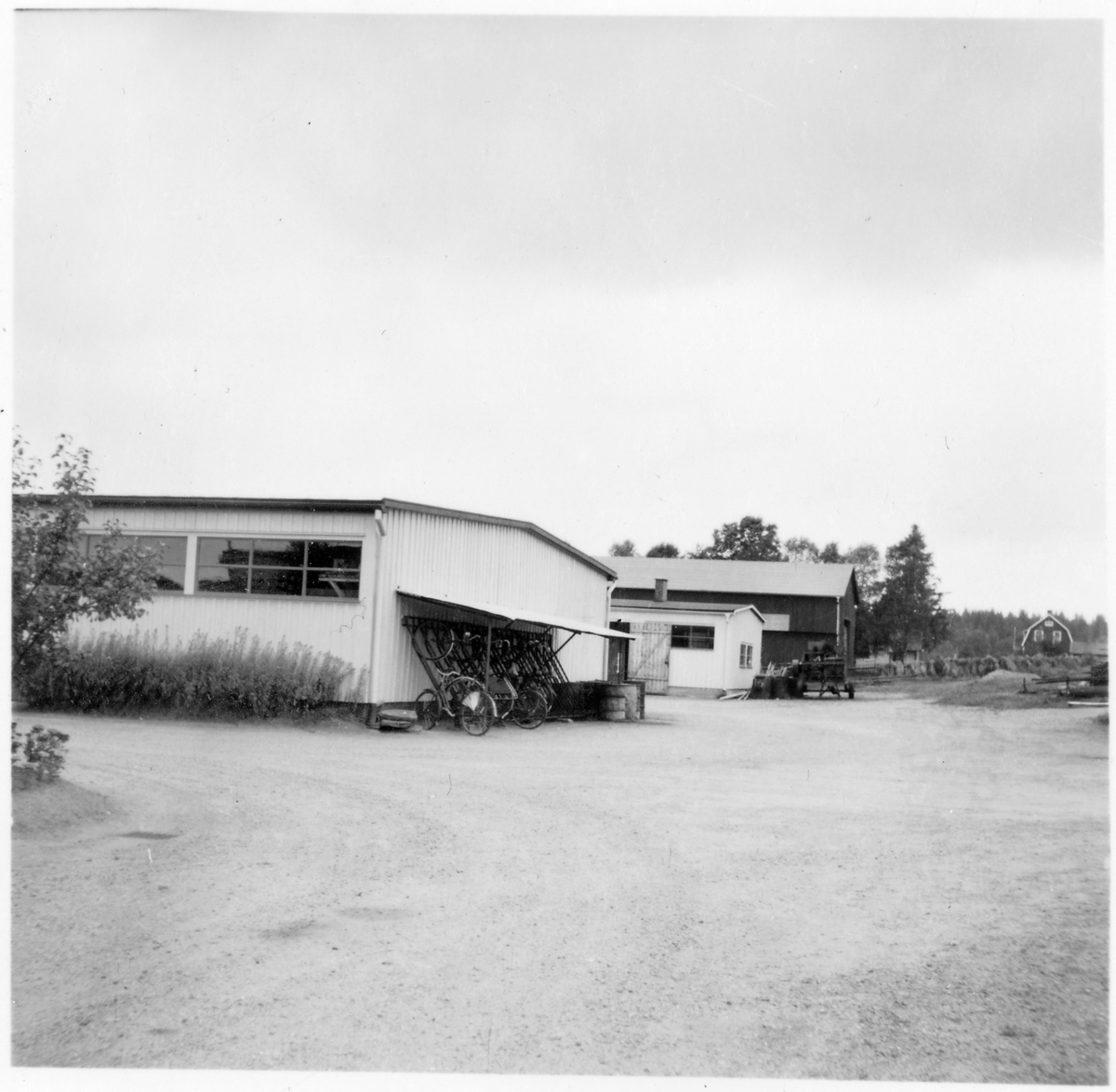 Vägstation G2, Berghem. Garagebyggnad. Vid gavel cykelställ med cyklar.
