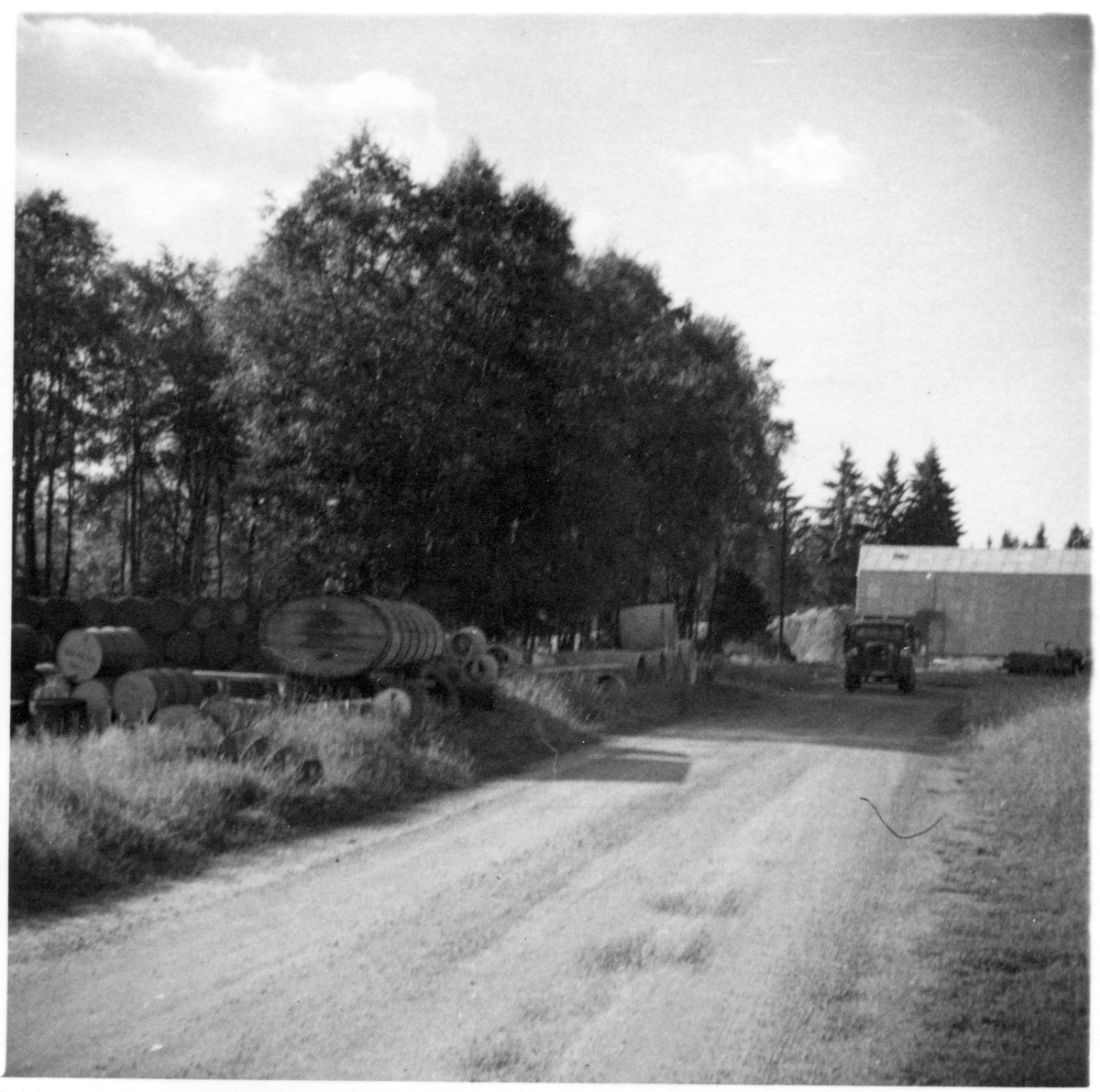 Vägstation F3, Smålandsstenar. Sand- och saltlada, förrådsbyggnader ute på ängsmark. Diverse materialupplag. Luttunna, lastbil.