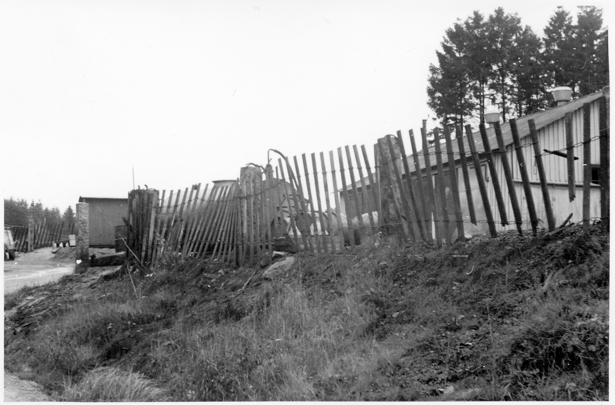 Vägstation O6 a &b, Dingle. Garagebyggnad, innanför trästaket av snöskärm.