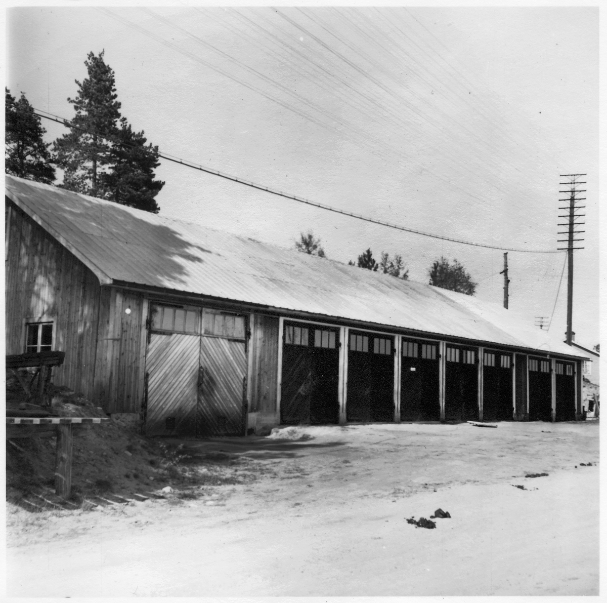 Vägstation X6, filial Delsbo. Garagebyggnad, eventuell verkstadsdel till vänster. Telefonstolpe.