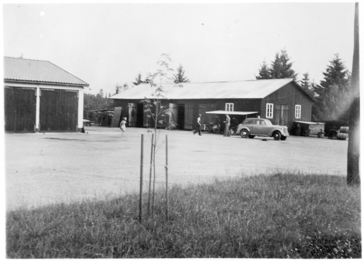 Vägstation P17, Ed. Garageplan med garagebyggnad till vänster, förrådsbyggnad till höger. Två manspersoner och ett barn, personbil, cykelställ med cyklar.