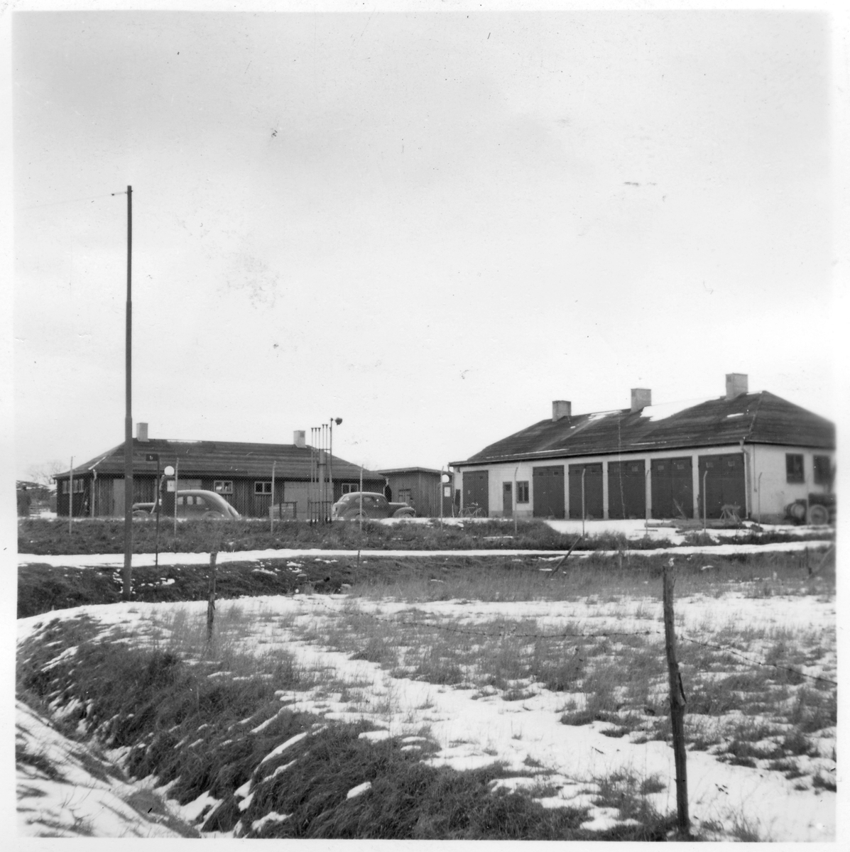 Vägstation U1, Arboga. Vy mot vägstationen med garagebyggnad och förrådsbyggnad. Två personbilar på garageplan. Bensinpump (drivmedelspumpar). Nätstängsel runt anläggningar.