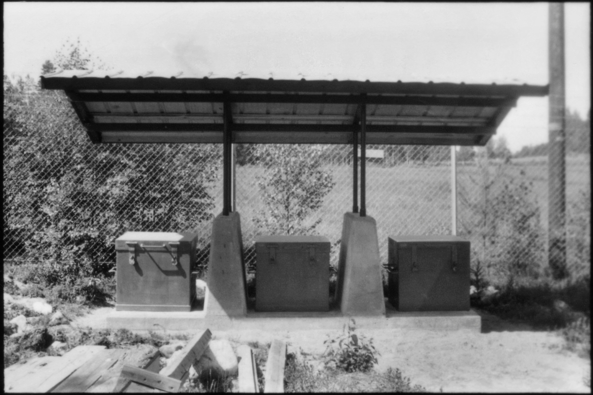 Vägstation Vmo X11, Delsbo. Tre sprängkistor för förvaring av dynamit, under öppet tak