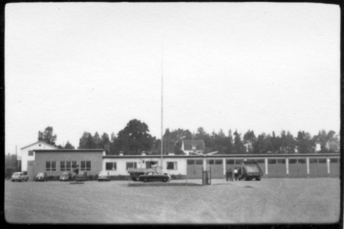 Vägstation H7, Högsby. Vägstationen huvudbyggnad med från vänster verkstadsdel, kontorsdel och garagedel. På garageplan bensinpumpar (drivmedelspumpar), lastbil med uppfällt flak. Tre manspersoner invid lastbilen. Radiomast. Personbilar.